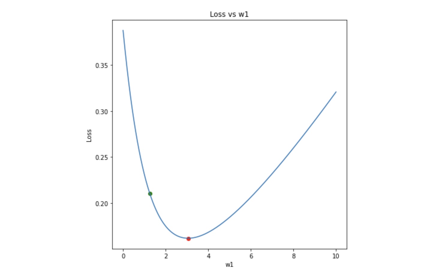 Now, the goal is to reach the red dot, starting from the green dot. In other words, we need to move downhill. Looking at the slope of the curve at the green dot, we can tell that increasing w1 (moving right) will lower the loss and therefore move the green dot closer to the red one. In mathematical terms, if the gradient of the loss with respect to w1 is negative, increase w1 to move downhill and vice versa. Therefore, w1 should be updated as: