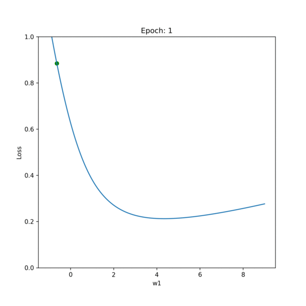 Let’s consider the first plot and discuss how w1 will be optimized. The process remains the same for the other parameters. Initially, the values for W and B are chosen randomly and so (w1, loss) will be randomly placed on this curve as shown by the green dot.