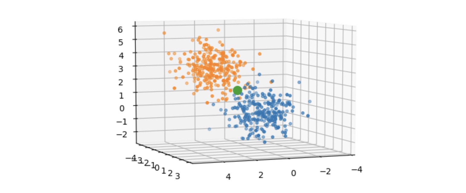 To visualize the dataset, let’s make our synthetic dataset where each data point (input x) is 3 dimensional, making it suitable to be plotted on a 3D chart. We will generate 250 points (cluster 0) in a cluster centered at the origin (0, 0, 0). A similar cluster of 250 points (cluster 1) is generated but not centered at the origin. Both clusters are relatively close but there is a clear separation as seen in the image below. These two clusters are the two classes of data points. The big green dot represents the centroid of the whole dataset.