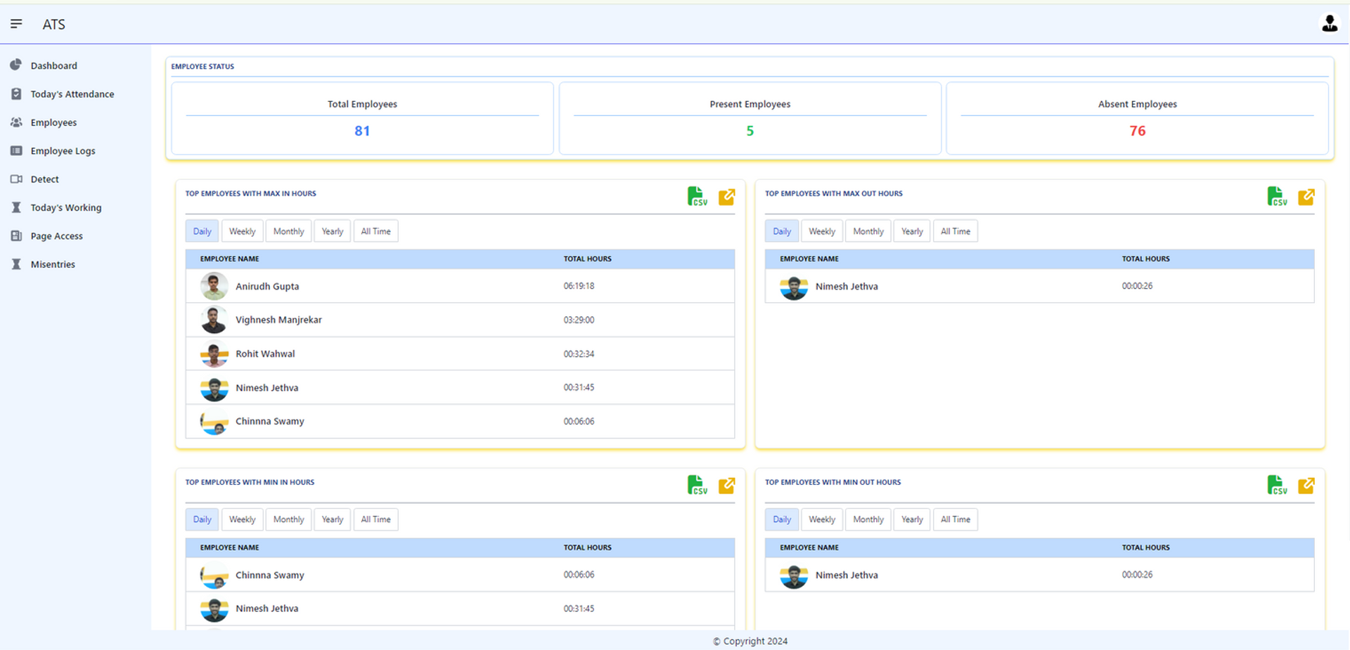 - Generates attendance reports with filtering options (daily, weekly, monthly).